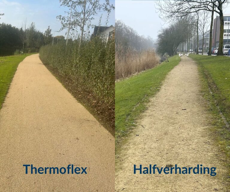Halfverharding geeft een natuurlijke uitstraling, maar vraagt meer onderhoud en is vaak minder prettig bij nat weer door plassen of gladheid. Thermoflex biedt een veilige en egale ondergrond en door de gekozen kleur en steentjes zorgt het voor een uitstraling die past in deze groene omgeving. Deze ondergrond heeft een levensduur van meer dan 20 jaar. Niet alleen praktisch dus maar ook duurzaam.